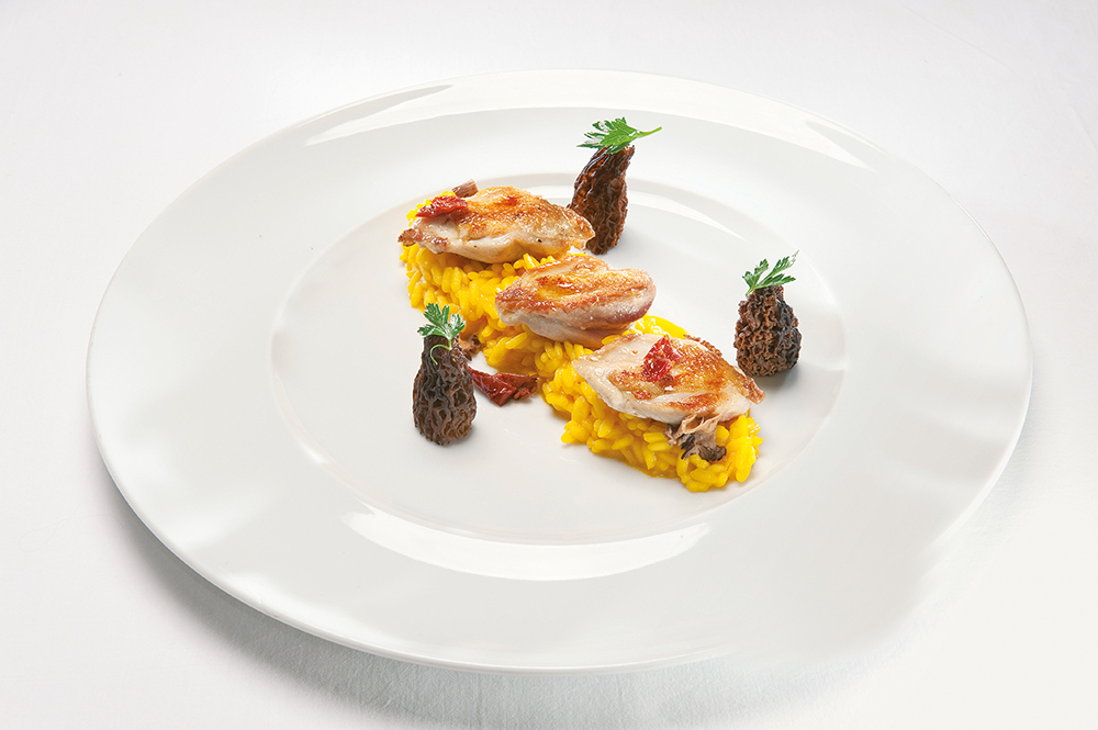 Das Risotto auf Teller verteilen und die Wachtelbrüste und die Morcheln darübergeben.