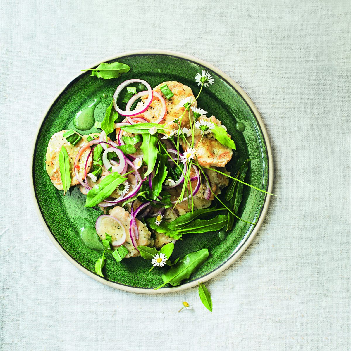4 Den übrigen Sauerampfer zerpflücken. Die zweite Zwiebel schälen und in dünne Ringe teilen. Die Knödel in dünne Scheiben schneiden und mit dem Dressing, Zwiebelringen, Sauerampfer und Gänseblümchen anrichten.