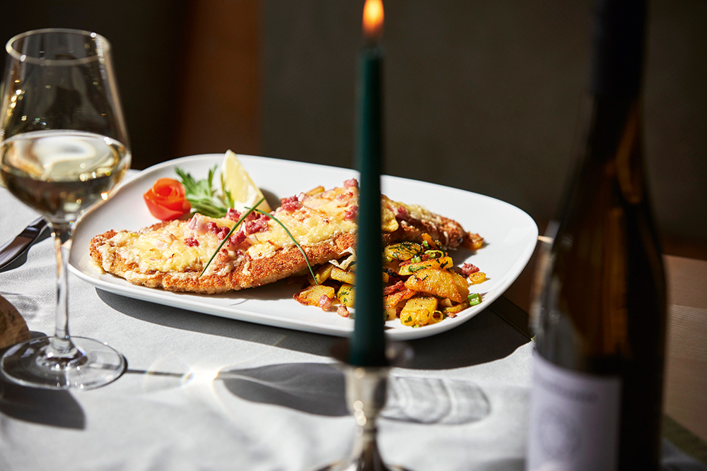 Für die Sauce hollandaise Butter in einem Topf bei milder Hitze zerlassen. Eigelbe mit Wein, Weißweinessig und Zitronensaft verrühren und mit Salz und Pfeffer würzen. Die Masse im warmen Wasserbad mit dem Schneebesen kräftig aufschlagen, bis sie cremig wird. Vom Wasserbad nehmen, Butter tröpfchenweise unterschlagen. Wenn die Hollandaise fertig ist, auf die Schnitzel geben, mit Zwiebelwürfeln, geriebenem Bergkäse und Würfelspeck dekorieren. Schnitzel im Backofen bei 180 °C Oberhitze etwa 5 Minuten lang überbacken, bis der Käse goldgelb verlaufen ist.
