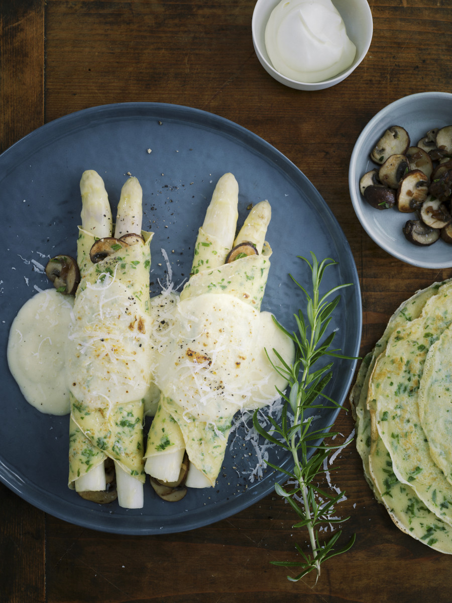 6. Auf jeden Pfannkuchen Pilze, einen Klecks Crème fraîche und Spargel legen. Einzeln zusammenrollen und nebeneinander in eine ofenfeste Form schichten. Mit Bechamelsauce bedecken, den geriebenen Parmesan darüberstreuen und ca. 20 Minuten überbacken.