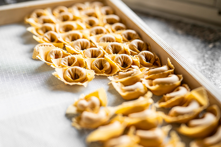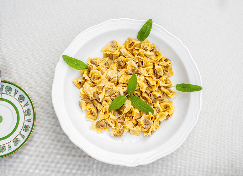 Wer jemals im Ristorante Alla Borsa Gast war, versteht sofort, dass es nicht nur darauf ankommt, den dünnwandigen Pastateig in Windeseile in Quadrate zu schneiden, mit diversen Füllungen zu belegen und zu kunstvollen Knoten zu schlingen. Sondern vielmehr, dass man mit Haut und Haar in die geheimnisvolle Welt der Küche eintaucht, am Morgen die Vorfreude darauf spürt, den Herd anzuschalten, und die Zutaten für die klassische Tortellini di Valeggio „Nodo d’Amore“ in der Nase zu haben. Diese fleischgefüllten Teigtaschen serviert Nadia mit Butter und Salbei.