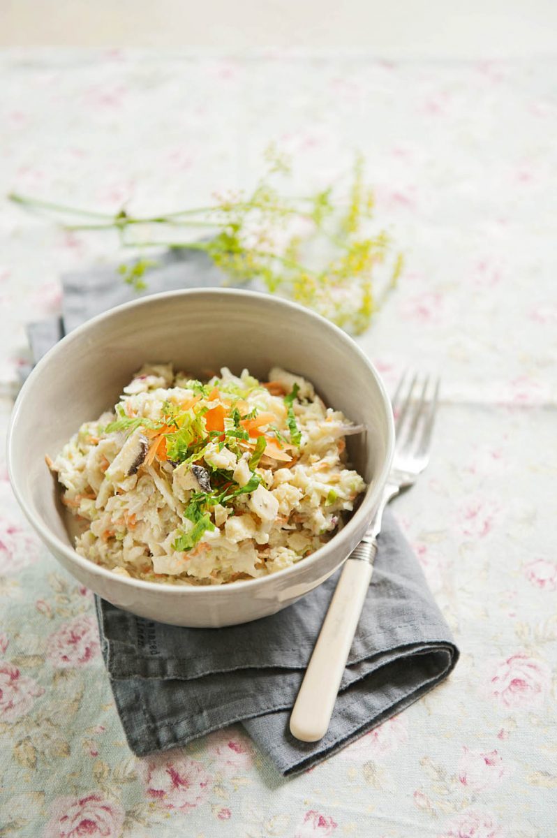 Die Möhre, die Zwiebel und den Apfel schälen und mit dem Sellerie und dem Kohl in sehr feine Streifen schneiden. Alle Zutaten in eine Schüssel geben und mit dem Dressing sorgfältig vermischen. 2–3 Stunden ziehen lassen.