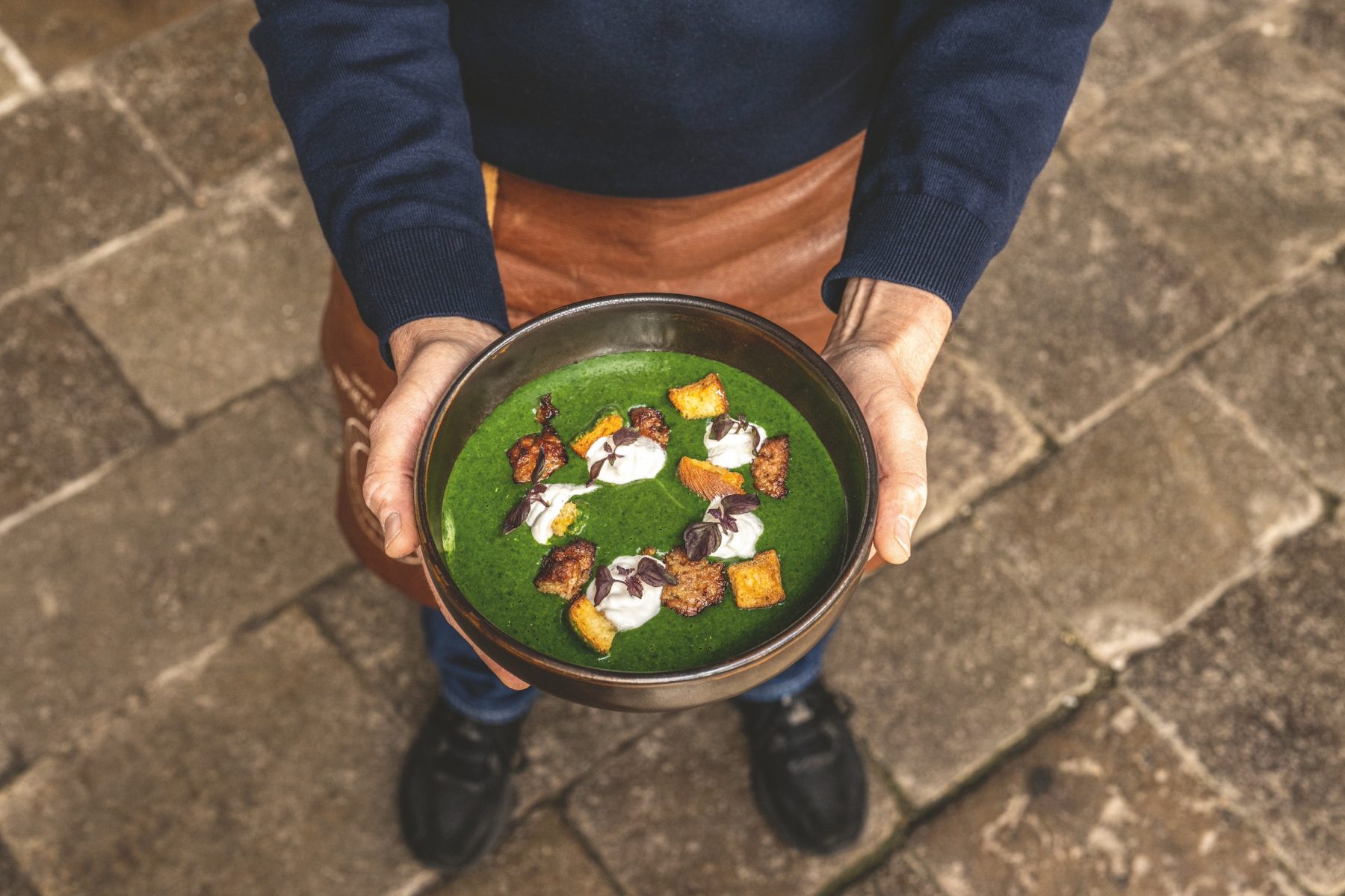 Vellutate di Spinaci – Samtige Spinatsuppe mit Pastin, Ziegenkäse und Knoblauch-Chili-Croûtons