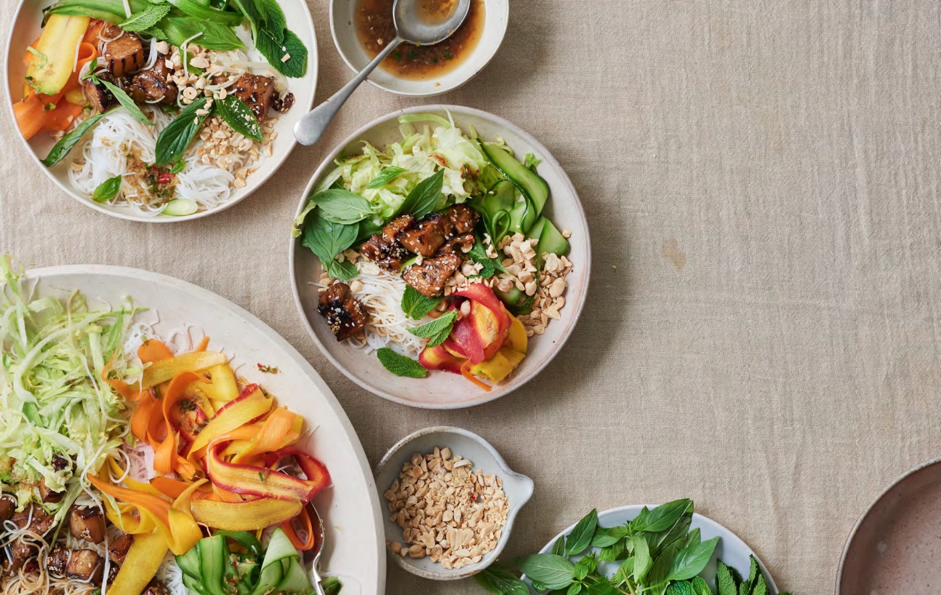 Die Reisnudeln nach Packungsanweisung kochen, dann unter fließendem kaltem Wasser abspülen und beiseitestellen.