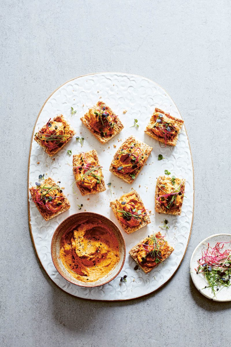 Dieses Rezept ist sehr vielseitig: Der Hummus eignet sich als Dip zu Rohkost, als Sauce zu Zucchinispaghetti oder sogar als Sushi-Füllung. Hier dient er als Aufstrich auf gerösteten Mini- Brotscheiben und wird mit Knoblauch-Schnittlauch und Sprossenmix garniert.