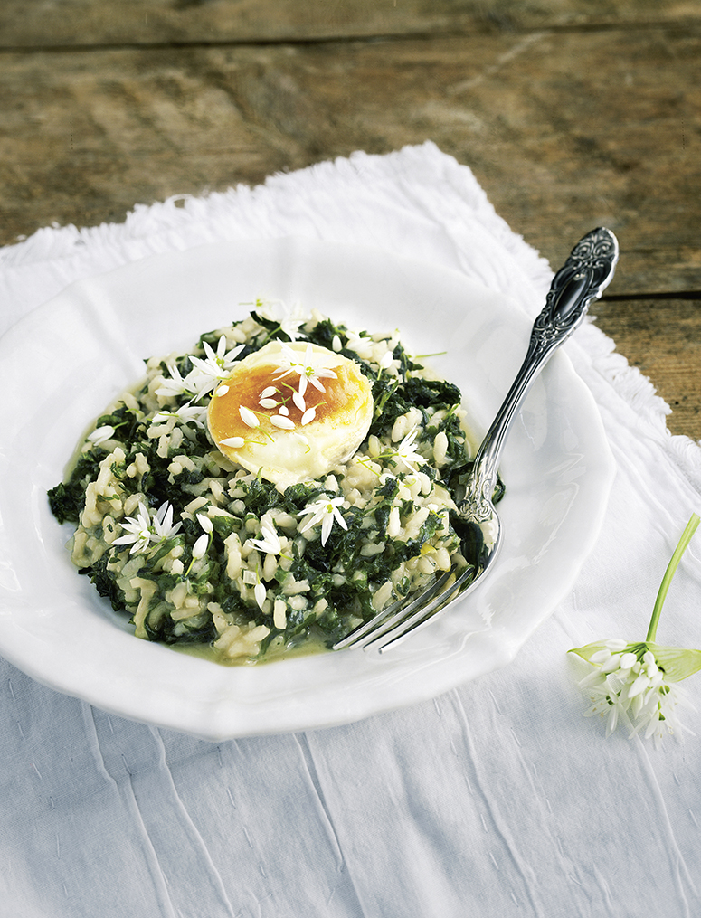 Brennnesselrisotto mit gratiniertem Ziegenkäse und Bärlauchblüten